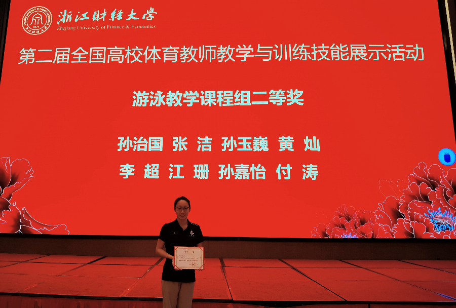 5月27日,第二届全国高校体育教师教学与训练技能展示活动在浙江财经大学(下沙校区)落下帷幕。我校suncitygroup太阳新城孙嘉怡老师荣获游泳教学课程组二等奖的优异成绩。